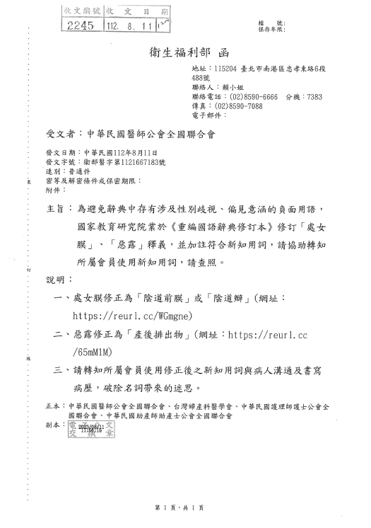 2023年,衛福部發函中華民國醫師公會全國聯合會與台灣婦產科醫學會等醫學團體,明確指出「處女膜」與「惡露」係涉及性別歧視及偏見的負面用語,要求相關人員與患者溝通及書寫病歷時,應使用更適切的用詞,破除名稱背後的社會迷思與性別歧視。
