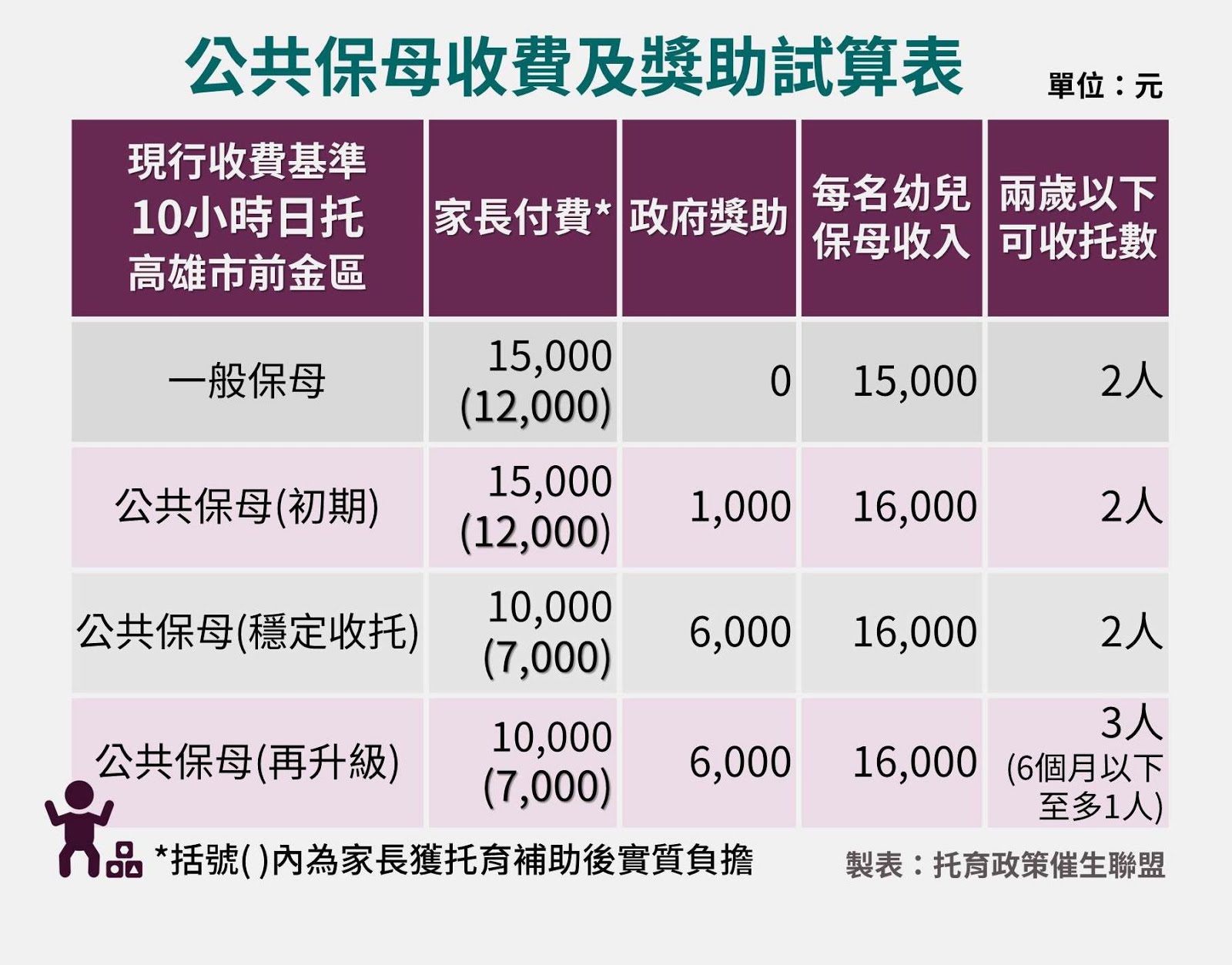 因此,托育政策催生聯盟主張,台灣應轉化北歐國家的「公辦保母」制度,創新推動「公共保母」服務型態。在現行的管理制度之上,再增辦保母的「考核及遴選制度」。考慮到政府的財政可負擔性,政府不需要直接聘僱,但是可以投注資源、獎助這群優良保母。給通過遴選的保母「加薪」的機會,但是由政府墊付加薪成本,降低家長經濟負擔。