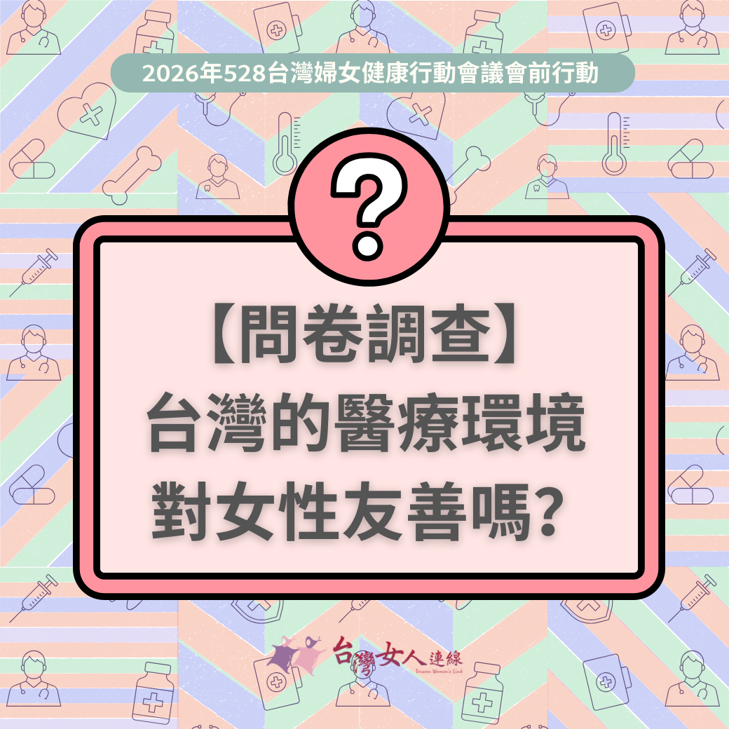 為了解女性在就醫相關經驗中的真實感受,以作為推動女性友善醫療政策與制度改革的參考,我們將於即日起至2026年4月20日止進行《台灣的醫療環境,對女性友善嗎?》問卷調查。